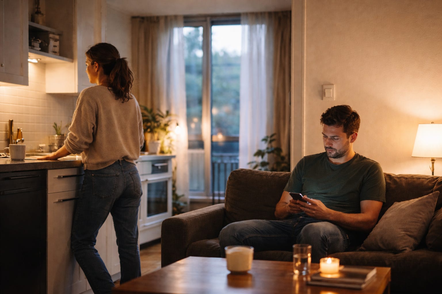 You see this most clearly in ordinary scenes couples don’t even think of as conflict. It’s late. One of you is standing at the sink, hands in the water, rinsing a dish that doesn’t really need it. The other is on the couch with a phone in hand. Someone asks, “Are you okay?” and it’s meant sincerely. The answer comes back, “I’m fine,” and the room changes anyway.